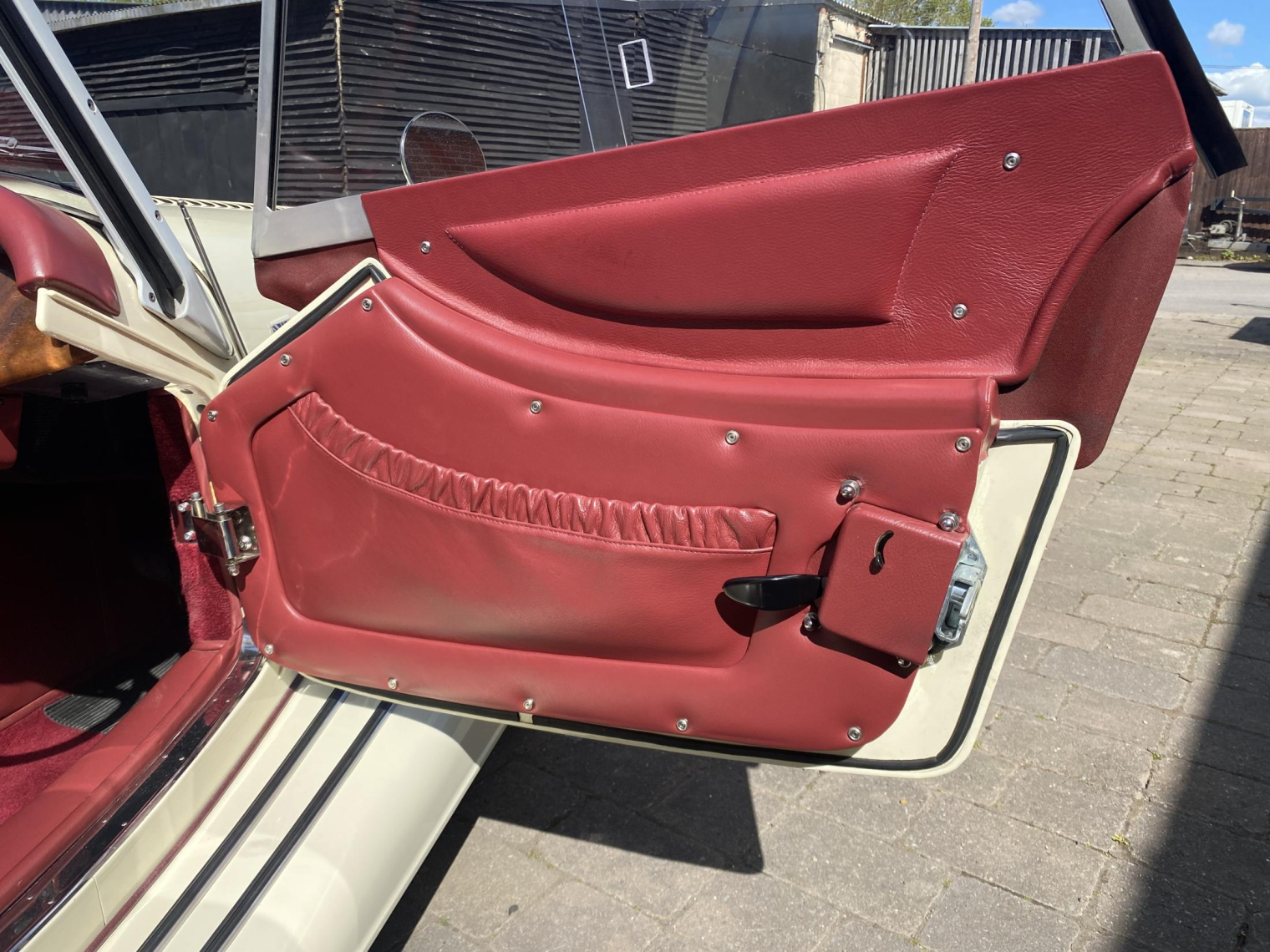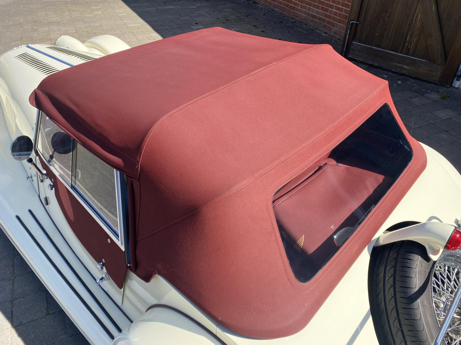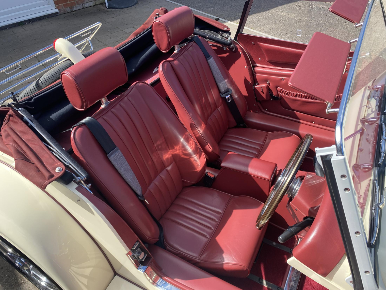 Finished in gleaming Sports Ivory with a contrasting Mulberry Red leather interior, complemented by maroon mohair wet-weather equipment and matching details including the arm rest, side-screen inserts and Hills Alive luggage.