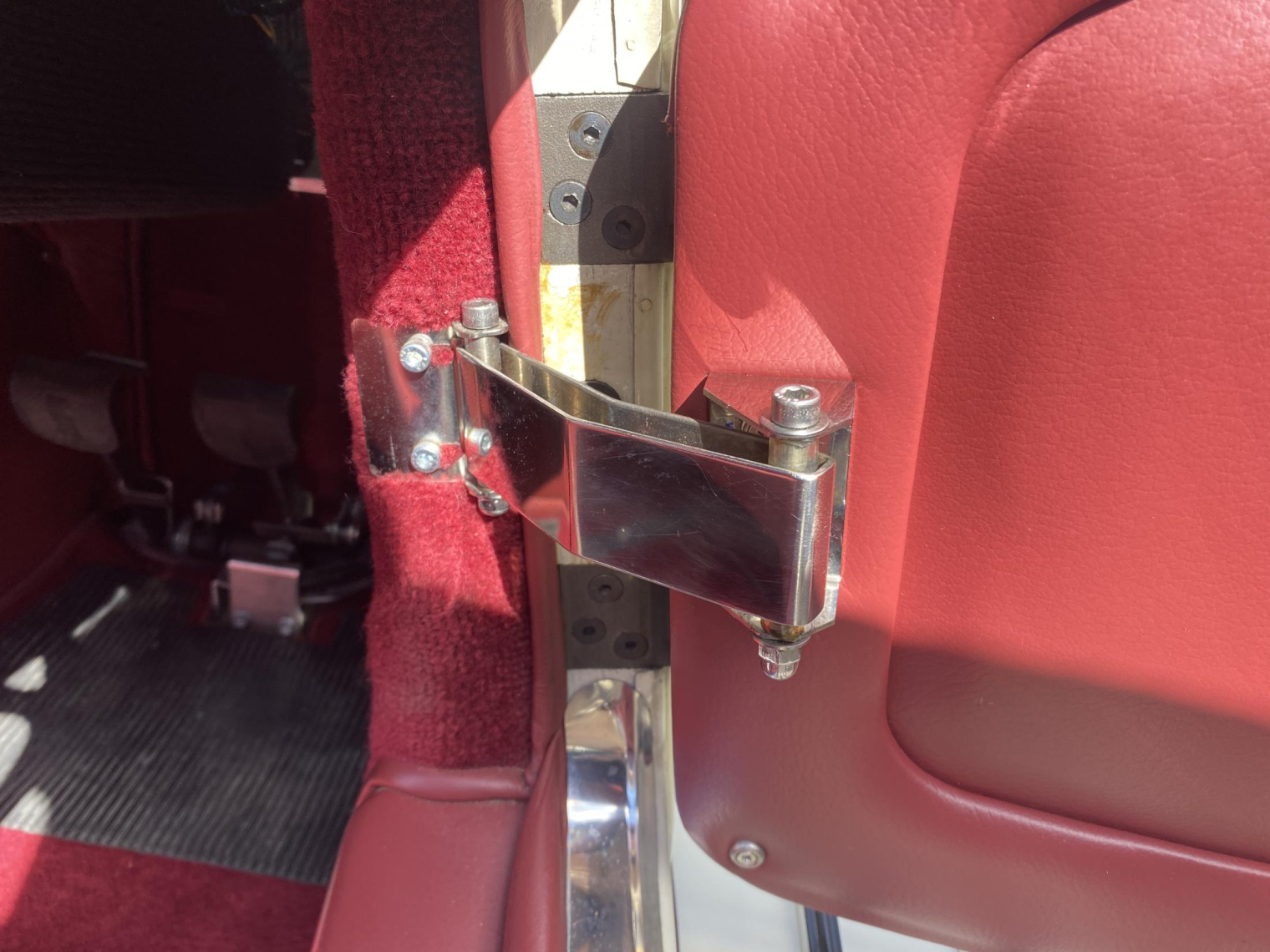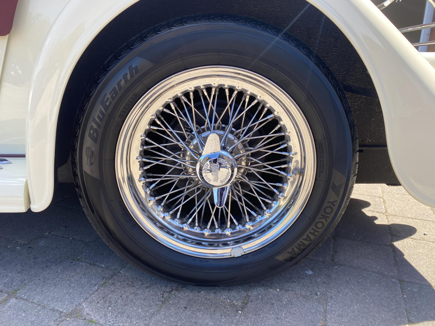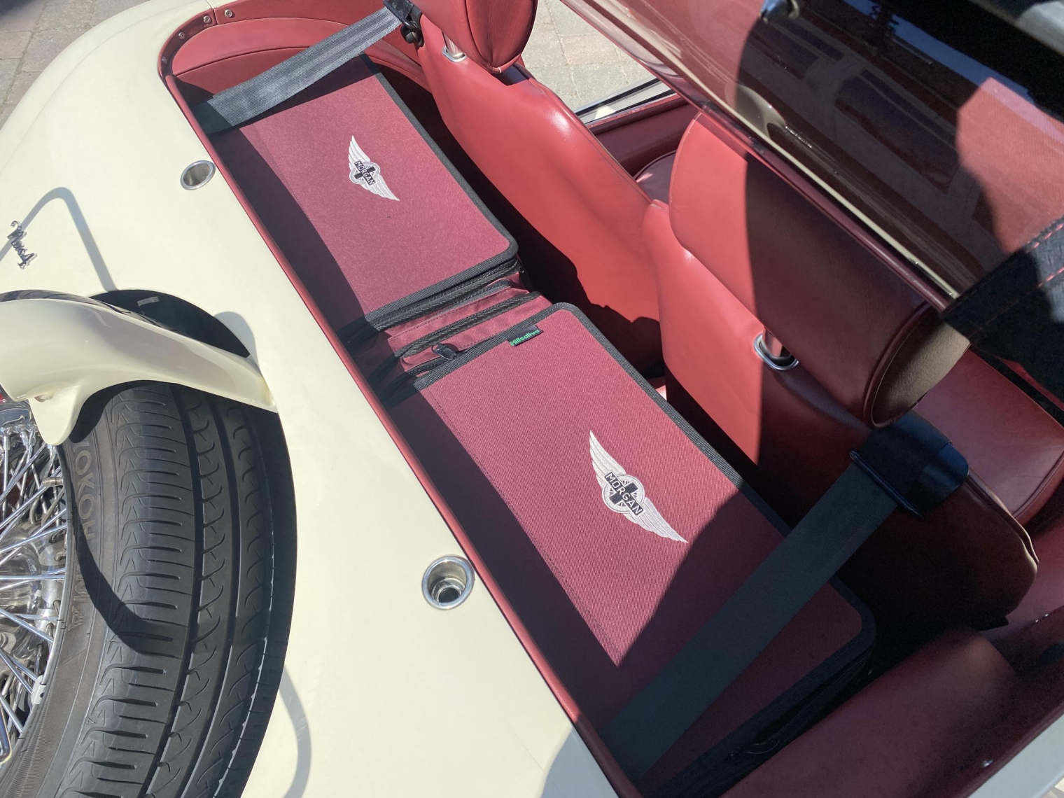 Finished in gleaming Sports Ivory with a contrasting Mulberry Red leather interior, complemented by maroon mohair wet-weather equipment and matching details including the arm rest, side-screen inserts and Hills Alive luggage.